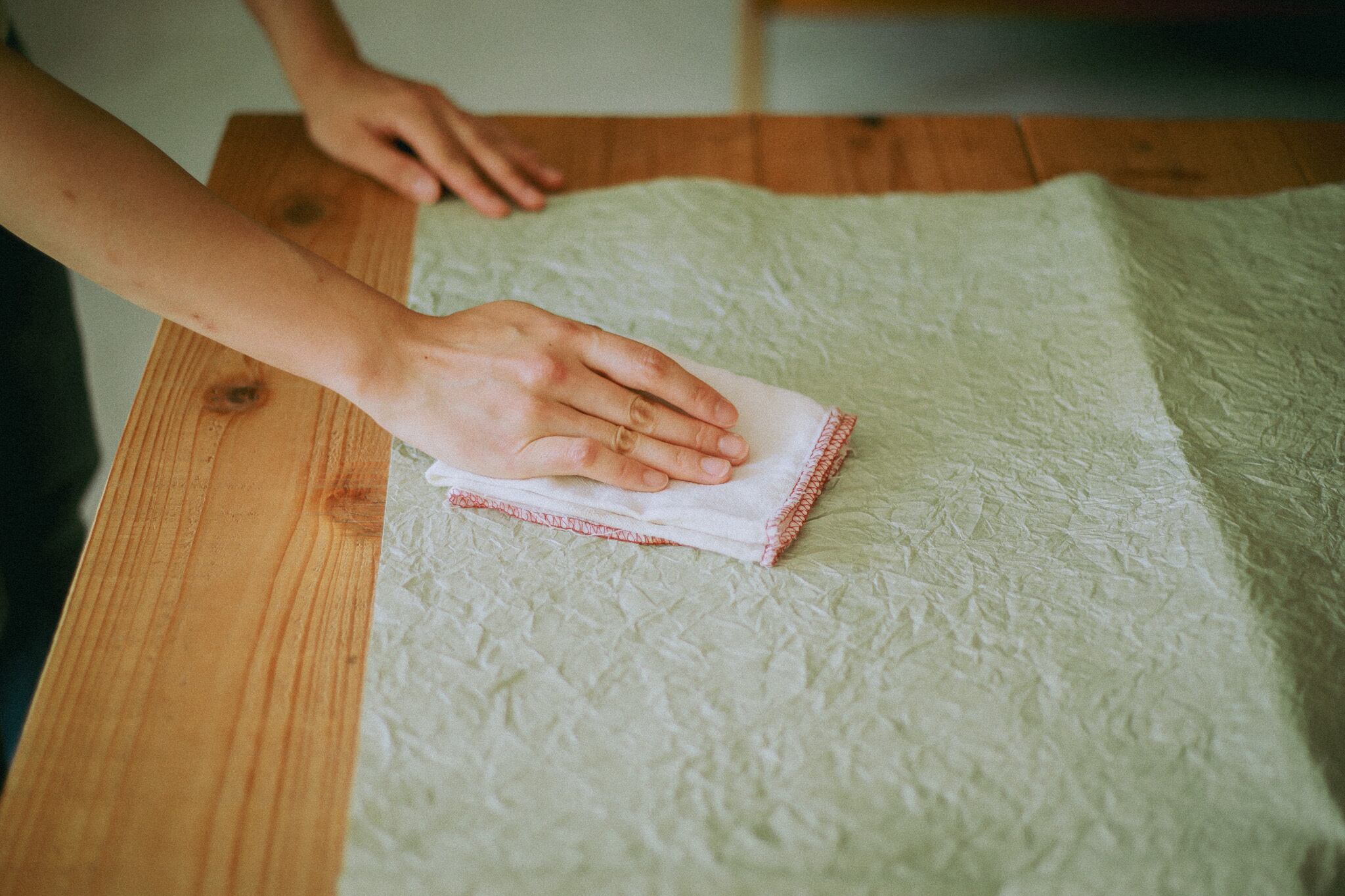 手揉みでシワを付けた和紙のテーブルマット。表面のみ、撥水・撥油加工も施されています。